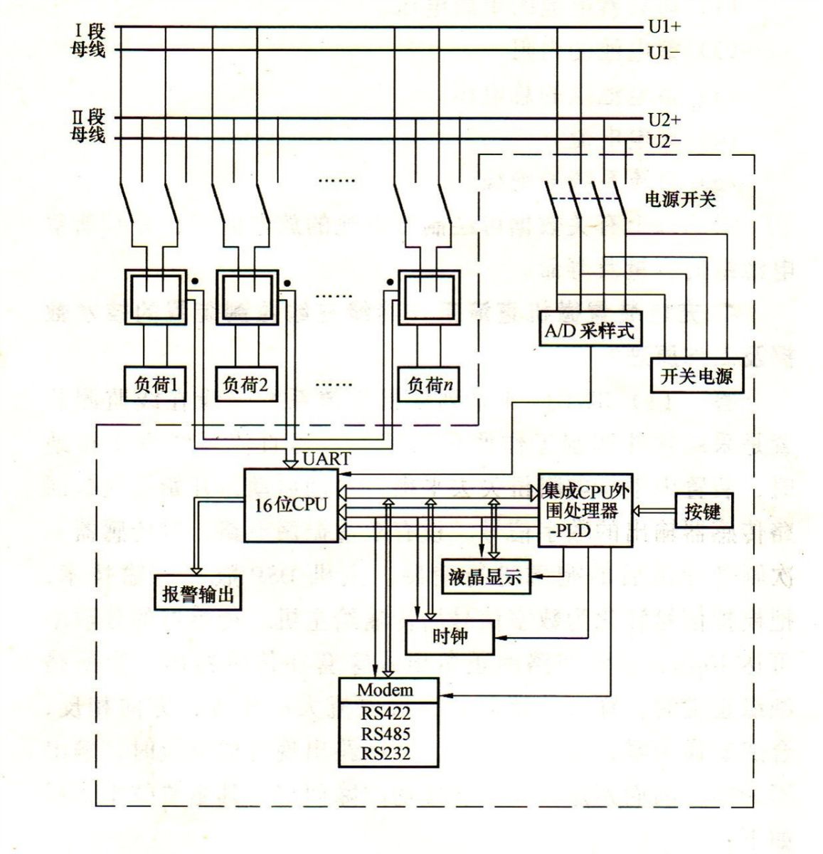 注  1本裝置適用于一段母線,也適用于二段母線。2圖中UART分為四束總線,即UARTl、UART2、UART3、UART4,每束總線帶32路傳感器。